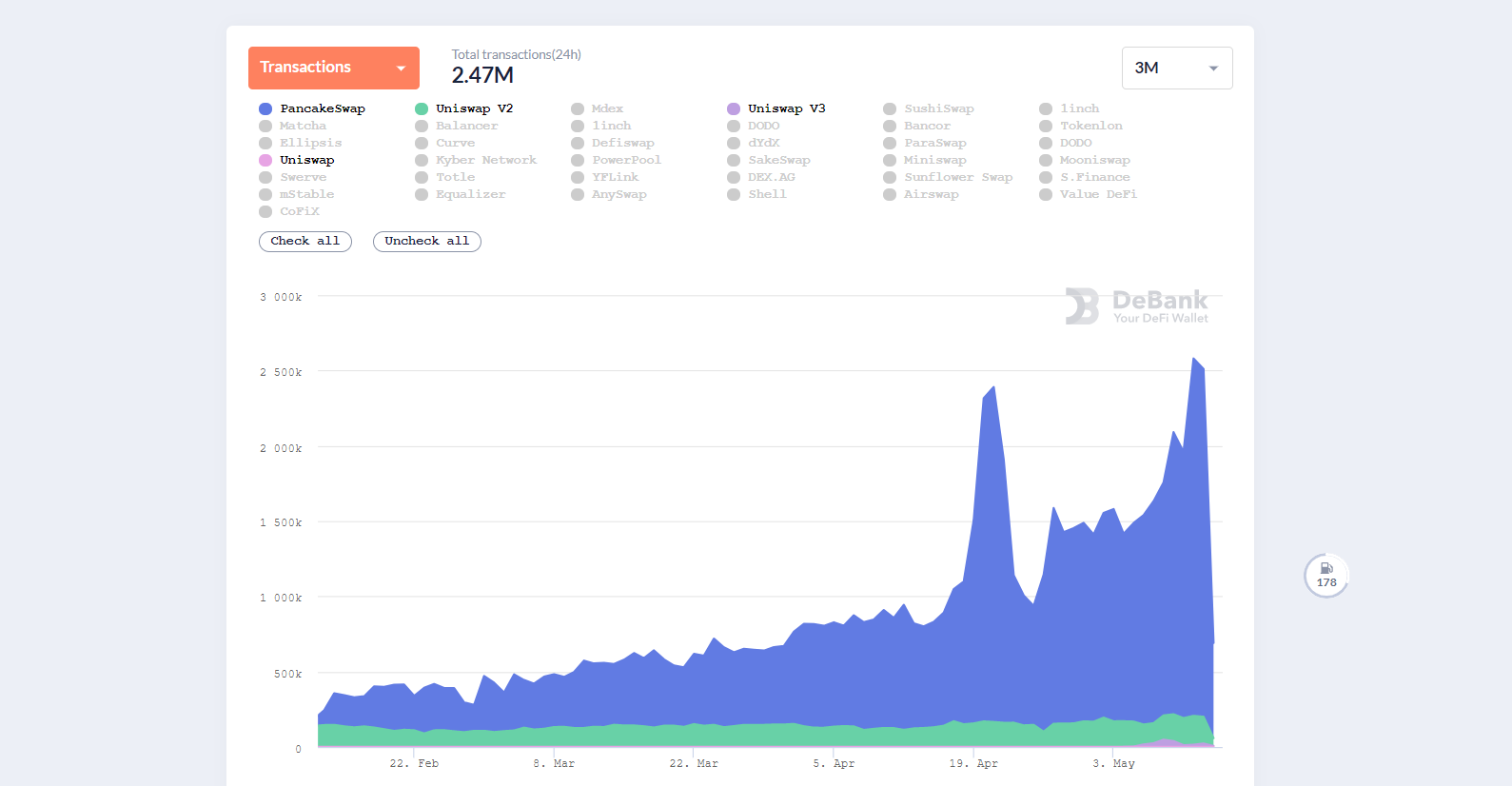 The total transaction of 2.47 million carried out on both DEX services in the last 24hrs places PancakeSwap ahead of Uniswap (V1, V2, and V3) with a whopping $2.5 billion in Volume, with 2,135,910 total transactions carried out.