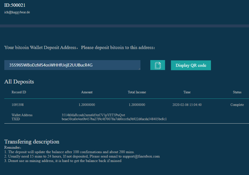 Wallet to my finexbox.com account2) Screenshot 2 (deposit_finexbox.png): The successful deposit at my