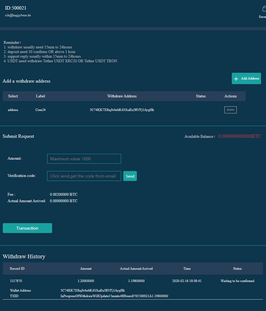 withdrawal stuck at “waiting for confirmation” since 16th. Feb. 2020 (See