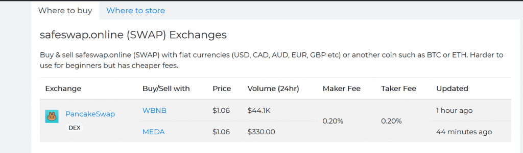 SafeSwap TM is a decentralized trading system that enables the exchange of different types of cryptocurrency. SafeSwap is a Smart Contract-based program that interfaces directly with metamask, trust wallet, and other third-party wallets after SafeSwap Online was listed on Coinbuddy. Information about the price market cap and where to buy or sell your SafeSwap token is displayed.